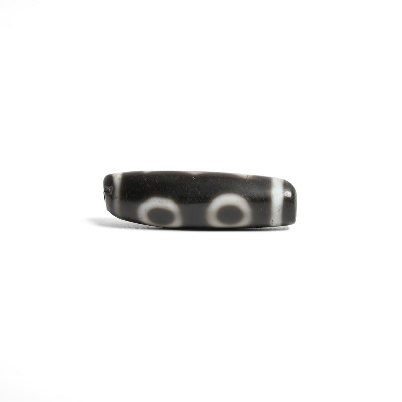 Product Description: This is a rare Three-Eyed Dzi Bead, featuring the characteristic "eyes" that define Dzi Beads. The bead's design includes a single outlined eye and dual eyes, collectively referred to as "Three-Eyed," and has been highly valued since ancient times. Each eye is believed to represent one of the three deities: Fortune, Prosperity, and Longevity. The bead's asymmetric internal structure, visible from the perforations on both sides, suggests it is an etched agate from Afghanistan or Pakistan. The bead displays blurred pattern boundaries and exhibits fine scratches and a natural sheen.