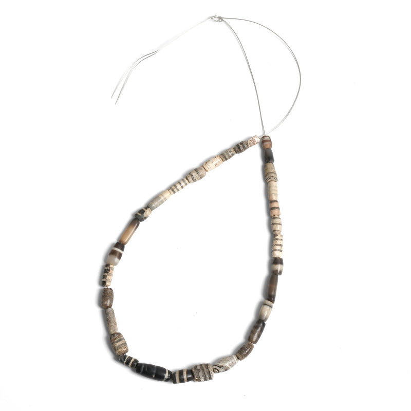Product Description: This is a Chong Dzi Beads Strand Necklace. Chong Dzi beads, known for their distinctive striped patterns, are a type of Dzi bead. In the realm of antique beads, stripes are believed to symbolize stability and harmony, serving to balance the wearer's body, mind, and spirit. This particular strand showcases the characteristic stripes of Chong Dzi beads, along with various unique patterns and the agate's signature strata-like cross-sections.
