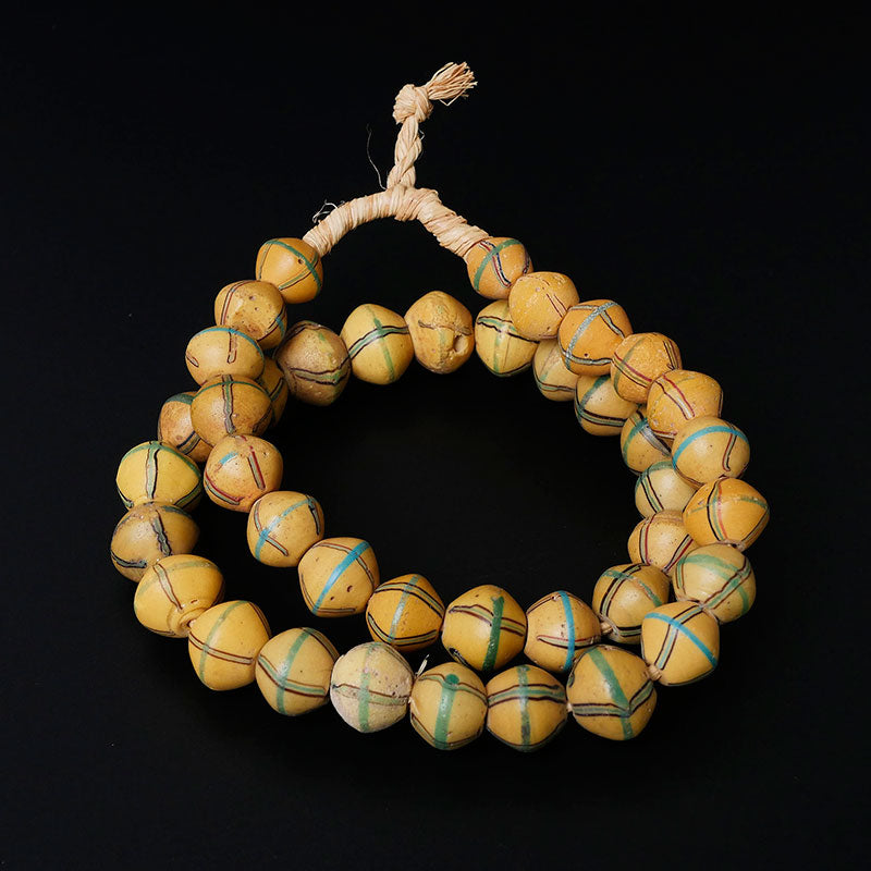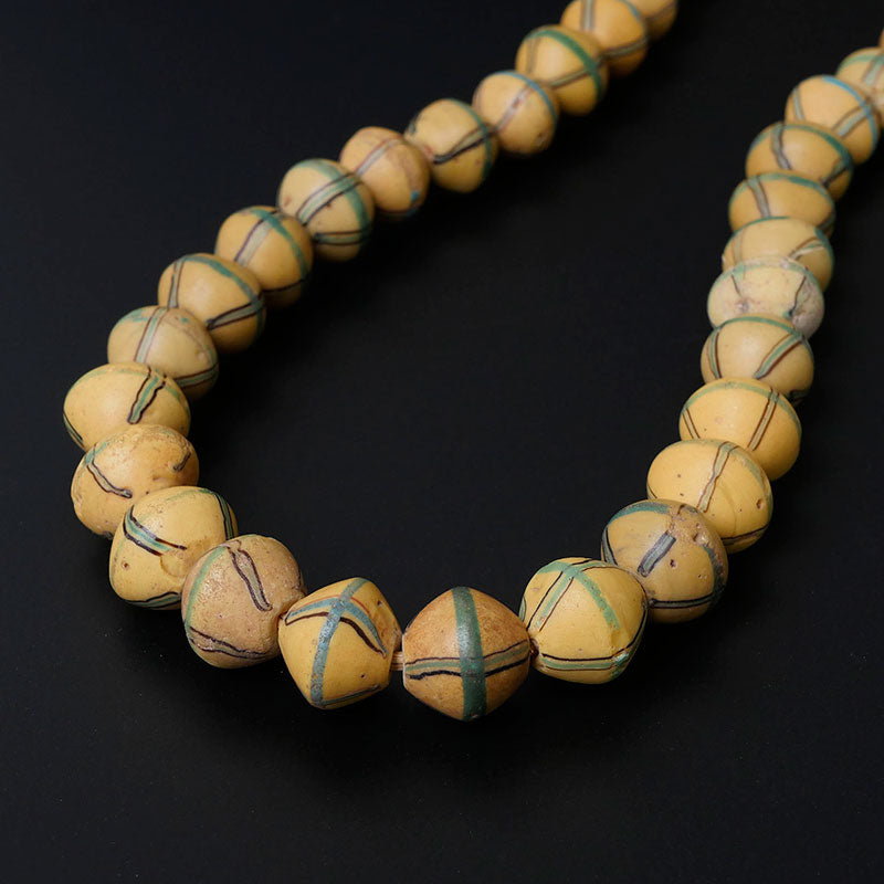 商品説明: キングビーズの美しいストランドをご紹介します。黄色のベースに黒とターコイズのデザインが特徴で、ぼんやりとしたラインがこのアンティーク品に柔らかく魅力的なタッチを加えています。これらのビーズは職人技と歴史の素晴らしい例です。