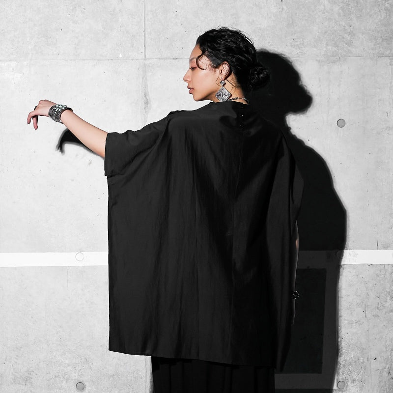 Product Description: Discover the luxurious comfort of the original design by Meguru, crafted from a delicate blend of Indian cotton and silk. This pullover features a minimalist yet sleek design, enhanced by layered tucks cascading from the shoulder, reminiscent of a draped shawl, adding an ethnic flair. Its oversized fit offers a relaxed feel, while the asymmetrical cut provides a unique accent. This versatile piece is suitable for both men and women, making it an excellent choice for menswear as well.