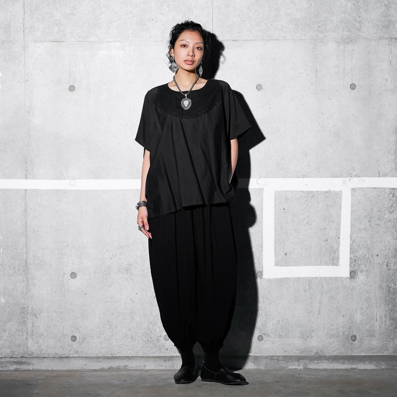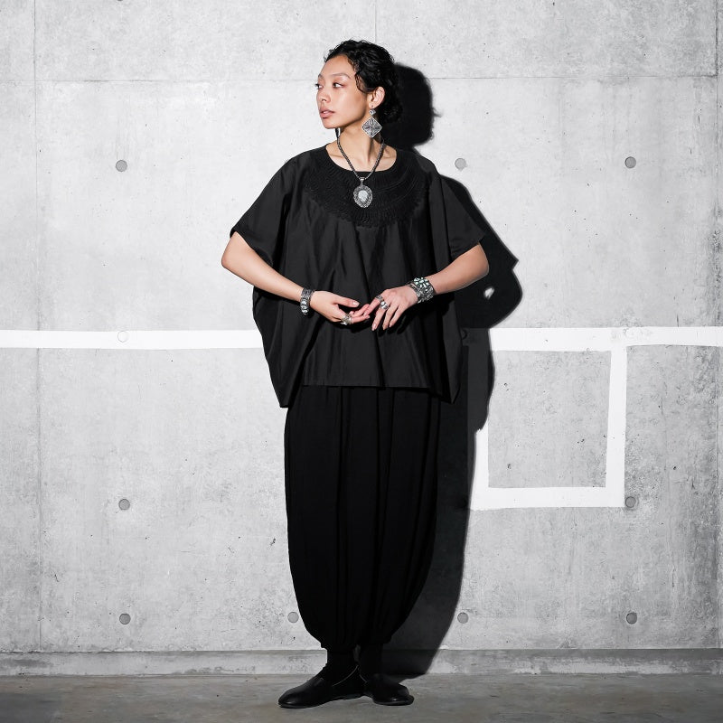 Product Description: Indulge in the luxurious feel of the original Meguru design fashion item, crafted from a supple blend of Indian cotton and silk. This pullover features traditional lace detailing, adding a unique ethnic flair to its simple yet striking design. The sophisticated style allows for versatile monochrome ensembles. With its oversized, relaxed fit, it offers a comfortable and effortless look. This piece pairs well with various items and is suitable for both men and women, making it a recommended choice for men as well.