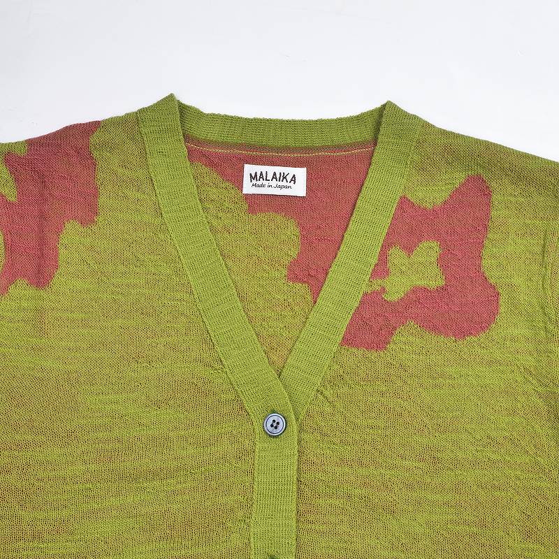 Product Description: Discover the charm of MALAIKA's original design with this Made in Japan knit cardigan, featuring a bold large flower pattern and a V-neck design. Crafted from 100% carefully selected wool, it offers a soft touch that is irresistible. The cardigan showcases a playful and eye-catching random-sized flower pattern, finished with ribbed trims at the front placket, cuffs, and hem. Available in vibrant shades of green, grey, and red, this knitwear is a testament to the skill of experienced craftsmen, providing a light and airy feel with a relaxed knit density.
