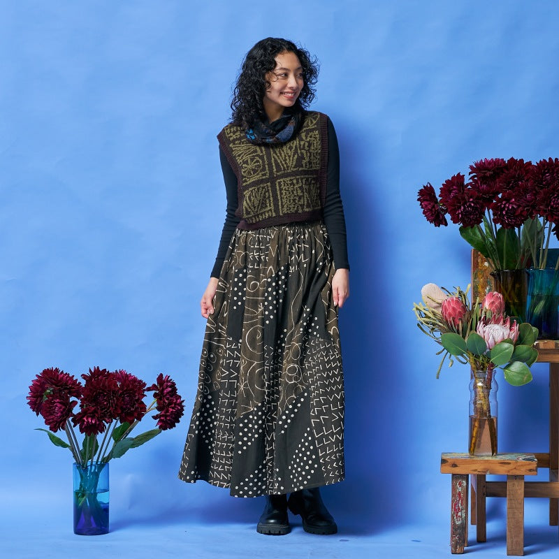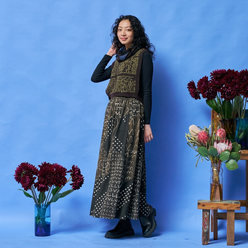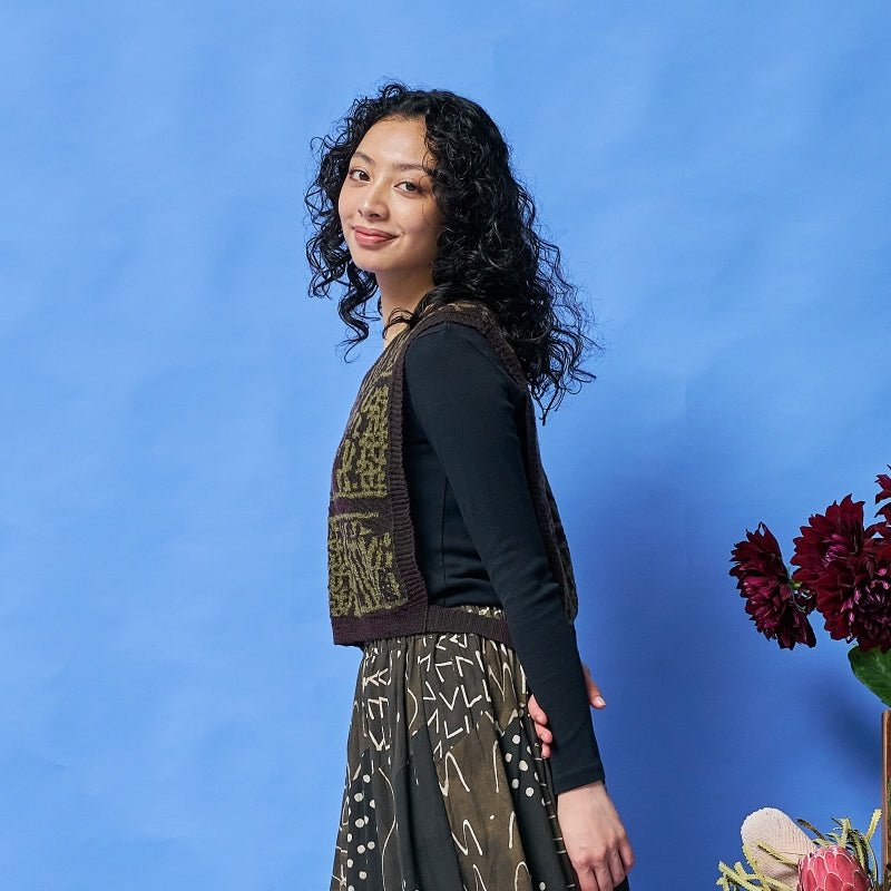 Product Description: Introducing Malaika's original design, a Made in Japan knitwear piece inspired by the intricate Bamileke fabric patterns. Crafted from carefully selected 100% wool, this vest offers a soft and luxurious touch. Its V-neck and side-cut square design make it easy to layer over shirts. Available in three versatile colors: Black, Brown, and Blue. The knit's airy texture is a testament to the skillful craftsmanship of seasoned artisans, ensuring a cozy and comfortable feel.