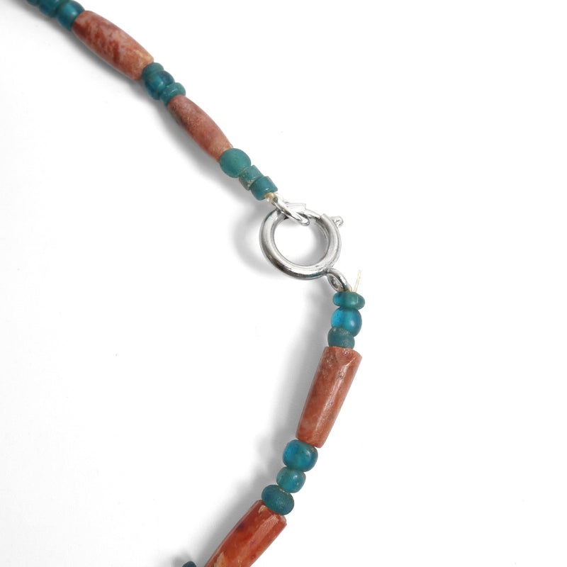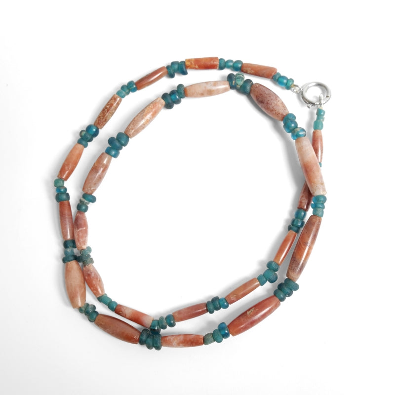 Product Description: This strand combines Roman glass beads and old carnelian, creating a striking piece. Roman beads, crafted during ancient Roman times, were widely distributed through Mediterranean trade. Their vivid blue-green color is attributed to copper elements. Paired with red agate (carnelian), a material historically used in amulets and ornaments, this piece offers a lightweight feel and a captivating contrast of colors.
