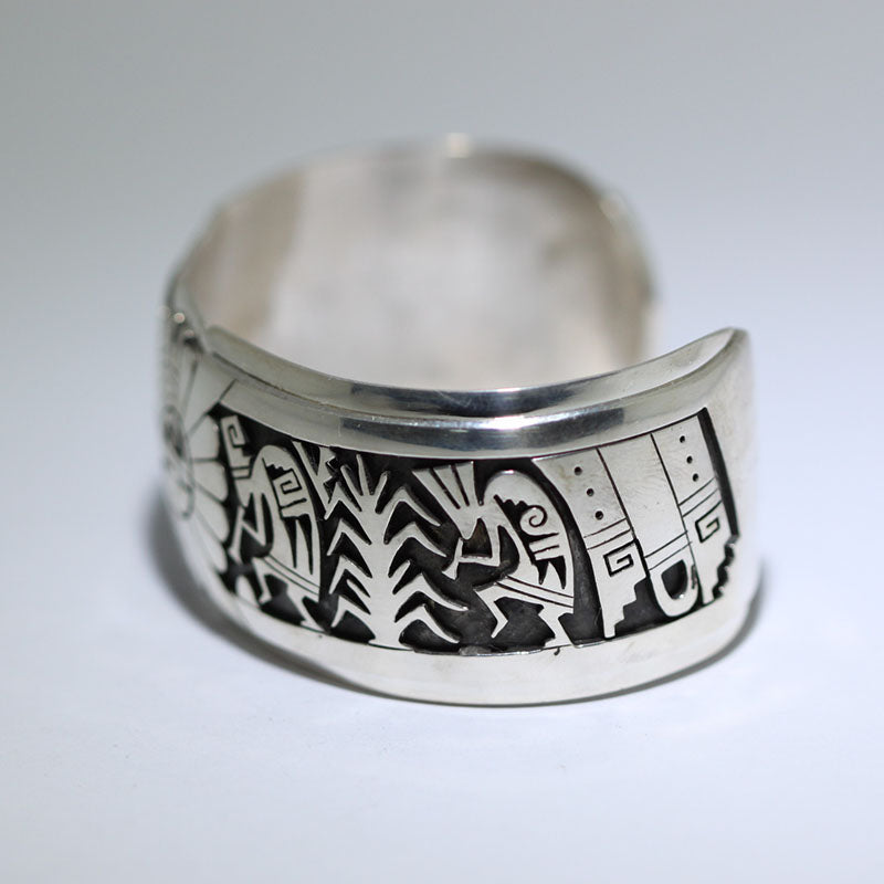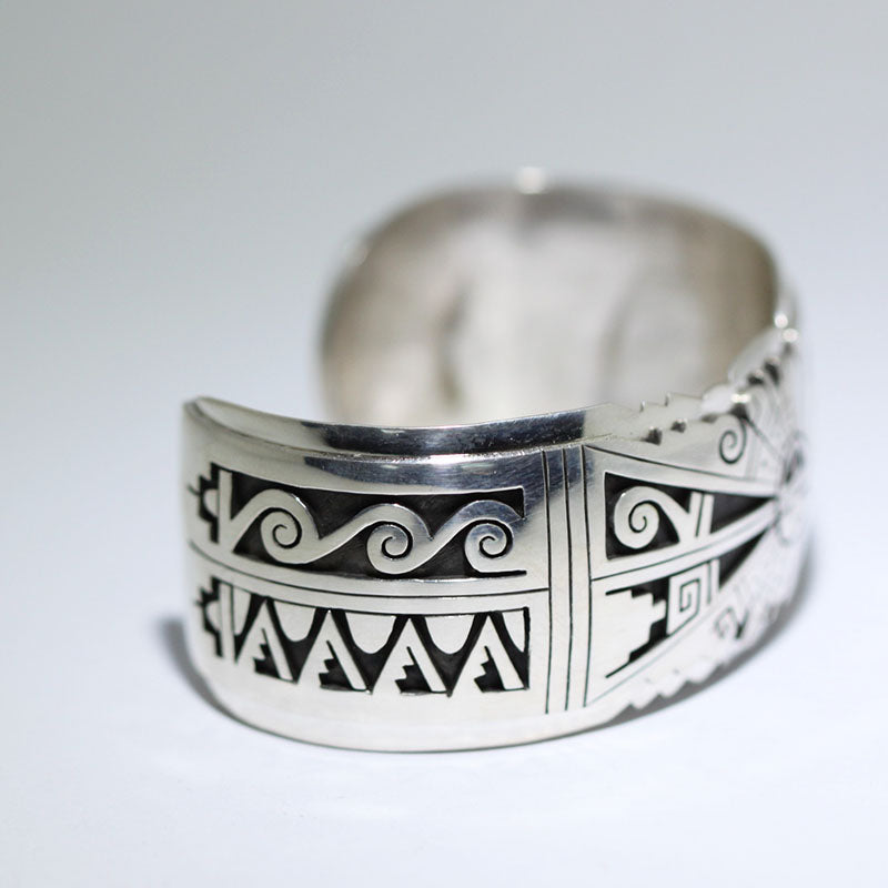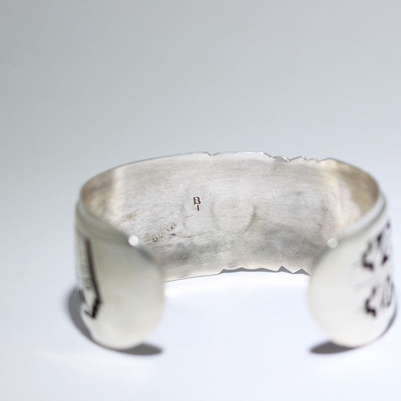 His jewelry design always comes from his Hopi tradition and ceremonies, which gives his jewelry different meanings. One piece is made with the reader of the village. His fine cutting and the unique design makes his jewelry one of the kind. His hallmark is BT.