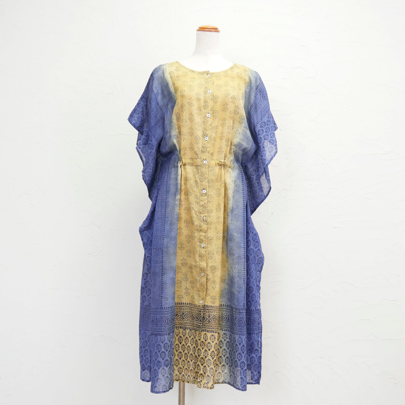 Product Description: Unveil the fusion of simplicity and elegance with this button-front dress, which marries hand block printing with gradient dyeing. Crafted to offer a breezy and light sensation, its gentle color scheme and slight transparency evoke a cool and serene impression. The dress features a relaxed poncho-like silhouette for effortless styling, complemented by deep slits that recommend pairing with bottoms for a complete look.