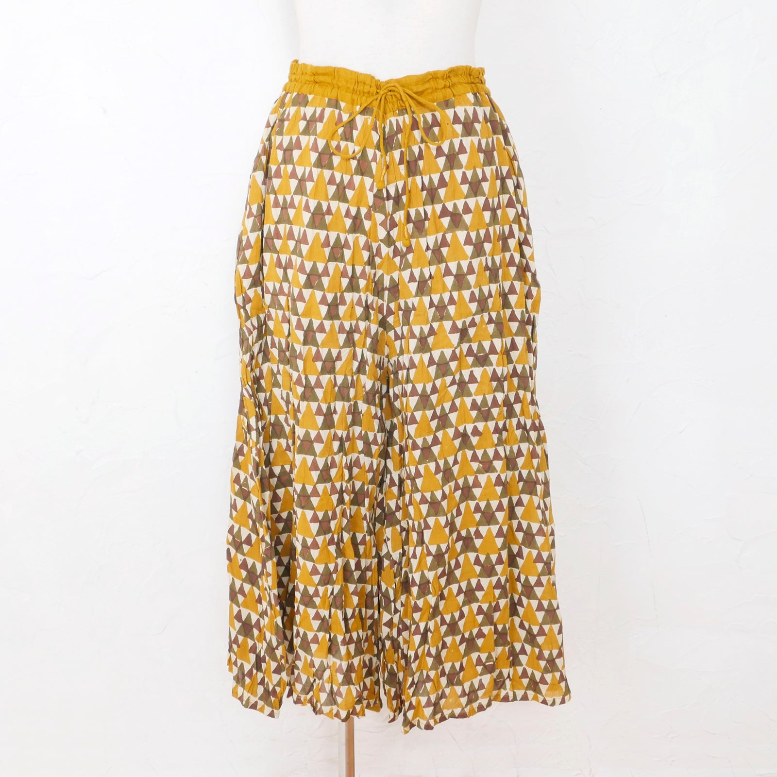 Product Overview: Make a bold statement with our all-over patterned pants, featuring a triangle motif meticulously created using the traditional Indian block printing technique. These wide-leg pants boast a unique design filled with personality. The combination of multiple colors lends an ethnic vibe to the garment. Pairing with a simple top can create a balanced look, while layering with a dress to subtly showcase the pattern offers an alternative style.