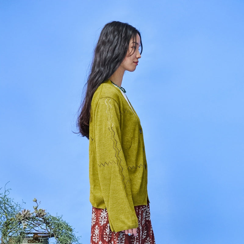 Product Description: Introducing our summer knit series, characterized by a unique texture derived from a blend of traditional Japanese paper yarn and rayon. This cardigan, meticulously crafted with a focus on the yarn combination, leverages the crispness of the paper yarn while offering the strength and softness of rayon. The result is a lightweight garment that provides a refreshing coolness against the skin. The standout feature is the asymmetric zigzag lace pattern, adding visual interest. With just the right amount of looseness, it offers a relaxed fit, making it an excellent choice for air conditioning and UV protection during summer.