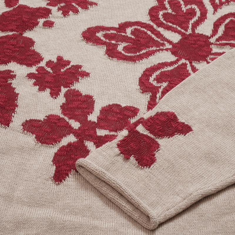 Product Description: Experience the exotic allure of our cotton-linen knit series, featuring a unique floral jacquard pattern that adds a touch of elegance to your ensemble. This knit pullover stands out with its bold floral design, crafted with interwoven threads for a smooth, comfortable fit without added bulk. A distinctive pattern on one sleeve adds a subtle highlight, making it a statement piece on its own. Easily pair it with your favorite bottoms to achieve a striking look. Designed with a relaxed silhouette, it's the perfect choice for a sophisticated, laid-back style. Available in two color combinations: a deep blue accented with exotic purple, and a warm beige contrasted with rich red.