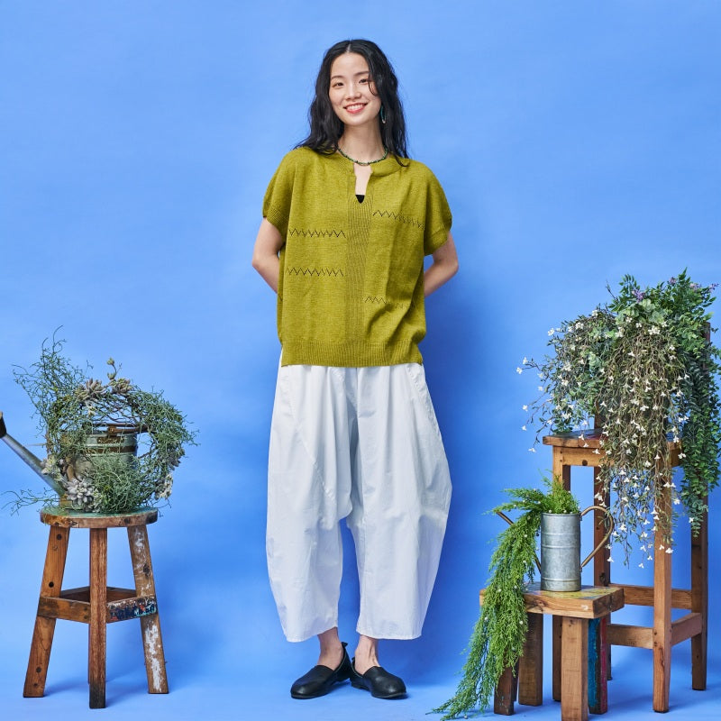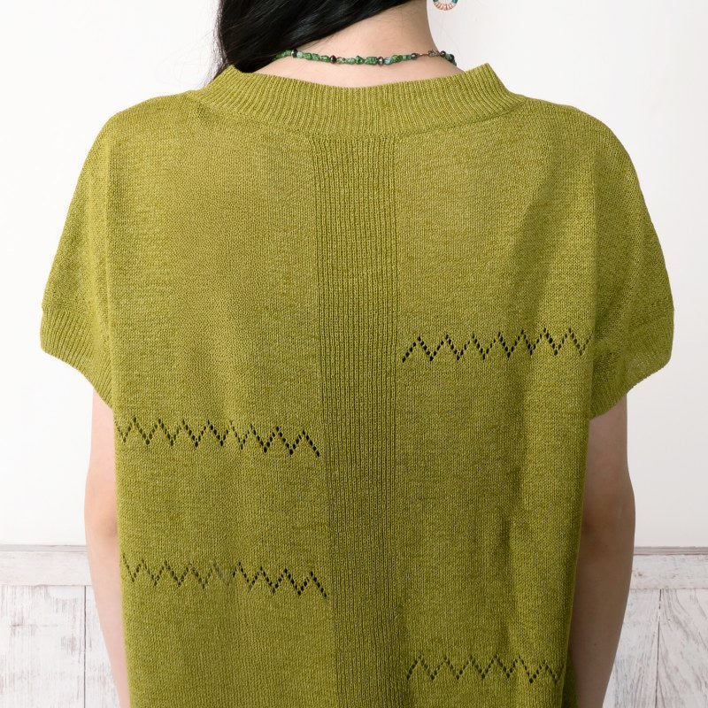 Product Description: Introducing our summer knit series featuring a unique blend of washi paper yarn and rayon, renowned for its crisp texture. This pullover is crafted with meticulous attention to detail, utilizing yarn that combines the crispness of washi with the strength and softness of rayon. The result is a lightweight garment with a cool, slightly chilly feel, perfect for warm weather. The standout feature is the asymmetrical zigzag openwork pattern, adding a touch of flair. With a relaxed yet not overly loose fit, this knit offers both comfort and a refreshing wearability, making it an ideal choice for staying cool and stylish.