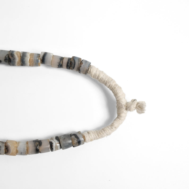 Product Description: Agate, a type of chalcedony mineral, is renowned for its decorative appeal. Historically valued as one of the seven treasures in Buddhism, agate symbolizes "harmony," "coexistence," and "health," making it a popular choice as a power stone today. This strand features prominent lines in blue-gray, natural, and pale orange hues, offering a distinct aesthetic.